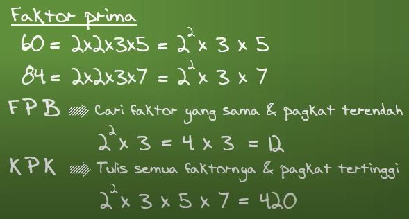 Fpbnya adalah 2 × 2 × 3 = 12. Jadi, waktu yang dibutuhkan untuk memenuhi bak mandi jika kedua kran dibuka adalah selama 20 menit. Contoh berikutnya kita buat agak susah. Pangkat terendah dari 5 adalah 1. Kpk (a,b) masih dengan contoh yang sama seperti di atas, kita dapat mencari kpk dari 24 dan 60 sebagai berikut.