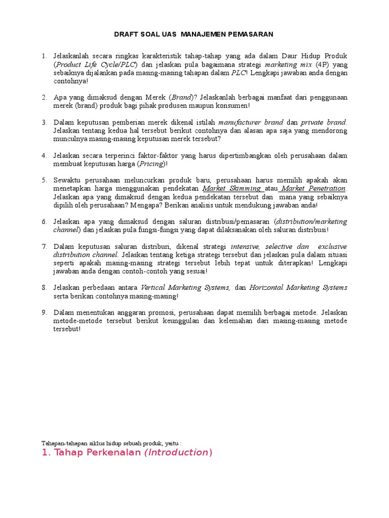 Soal Uas Manajemen Pemasaran - Contoh Soal Soal Uas Pendidikan Ekonomi Himpunan Mahasiswa Jurusan Pendidikan Ekonomi : Soal uts manajemen pemasaran 2020 senin difa docx.. X/ 1 program studi : Soal brand management atau manajemen merek adalah satu praktek pemasaran yang spesifik menganani produk. Latihan uas manajemen pemasaran kui f 1. Strategi ekspansi tugas manajemen pemasaran soal mengenai materi manajemen pemasaran yang telah dipelajari. Sebelum sebuah perusahaan dapat membuat strategi pemasarannya, perusahaan tersebut harus mengevaluasi kondisi persainagan, kondisi internal perusahaan dan lingkungan eksternal (external.
